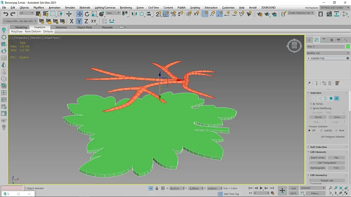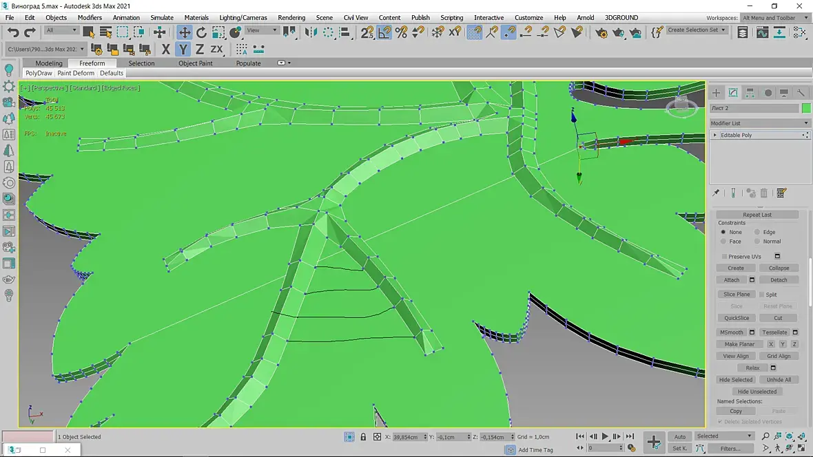 Прожилки на листик сделаны через shape merge, потом редактировались в эдит поли. Хотела сделать остальную сетку, а выяснилось, что полигон внизу закрылся от края до края, прожилки можно поднять отдельным элементом, посмотреть.