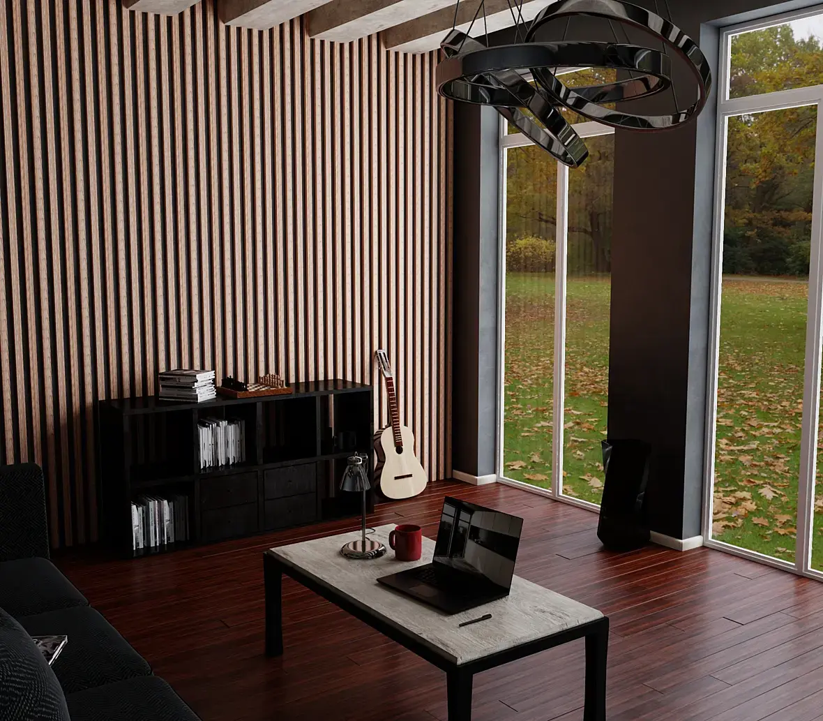 Модели: отсутствуют фаски, планки ламината слишком выпирают, стеновая рейка врезается в ж.б. балку, оконные профиля слишком примитивны, не хватает декора, камера завалилась.