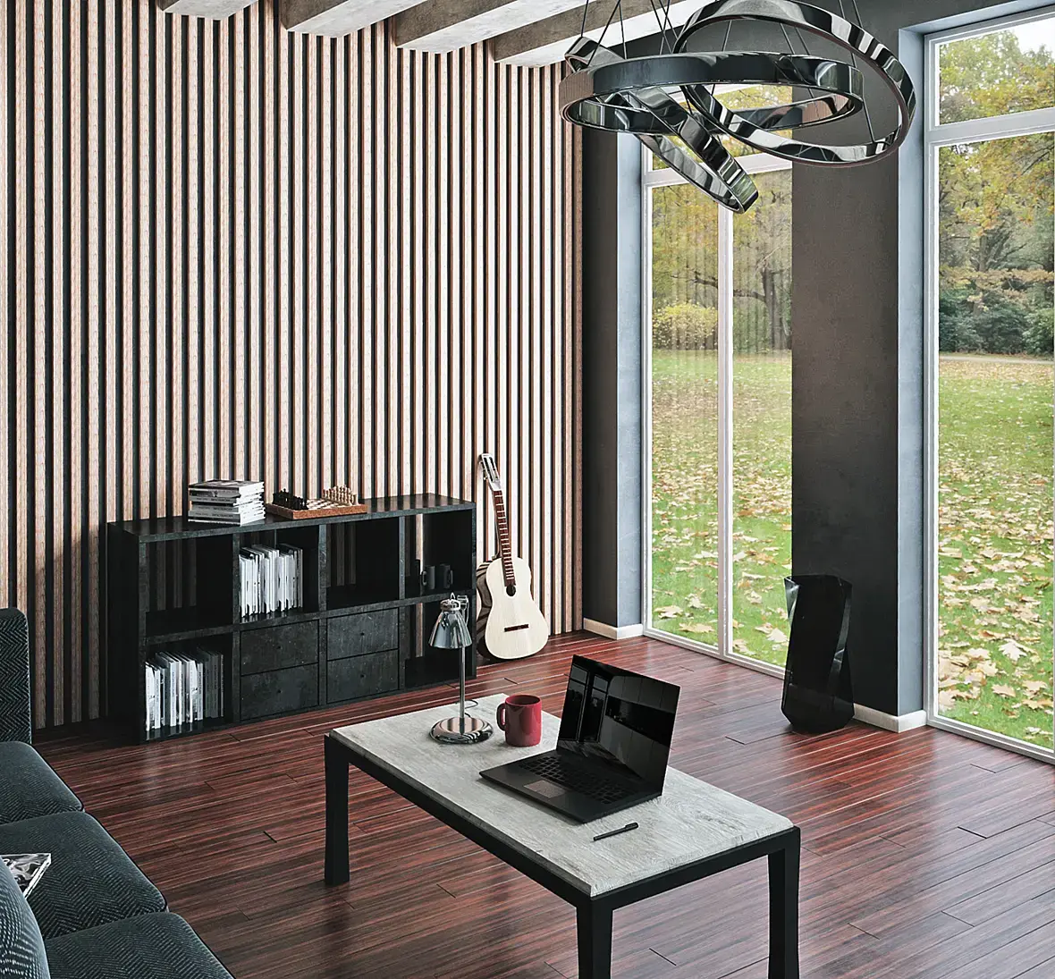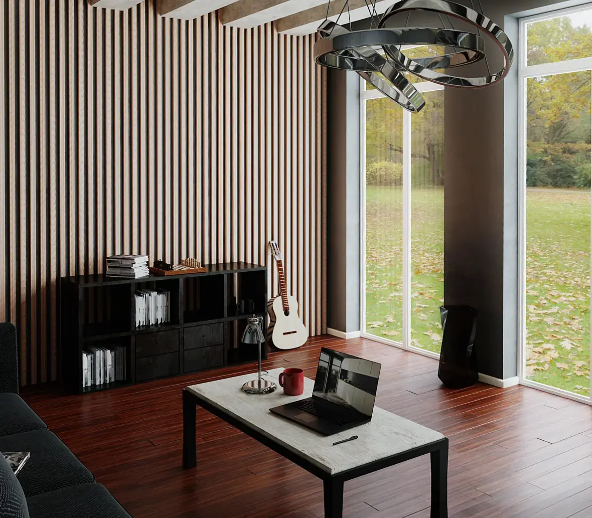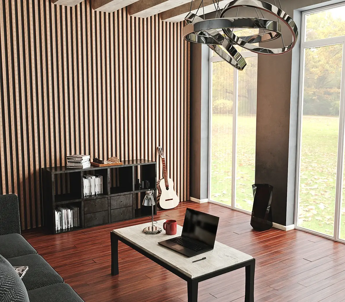 Материалы: плоские, без рельефа, на столе текстура дерева крупновата, угол дивана плоский, очень странный материал темного дерева на греденции.