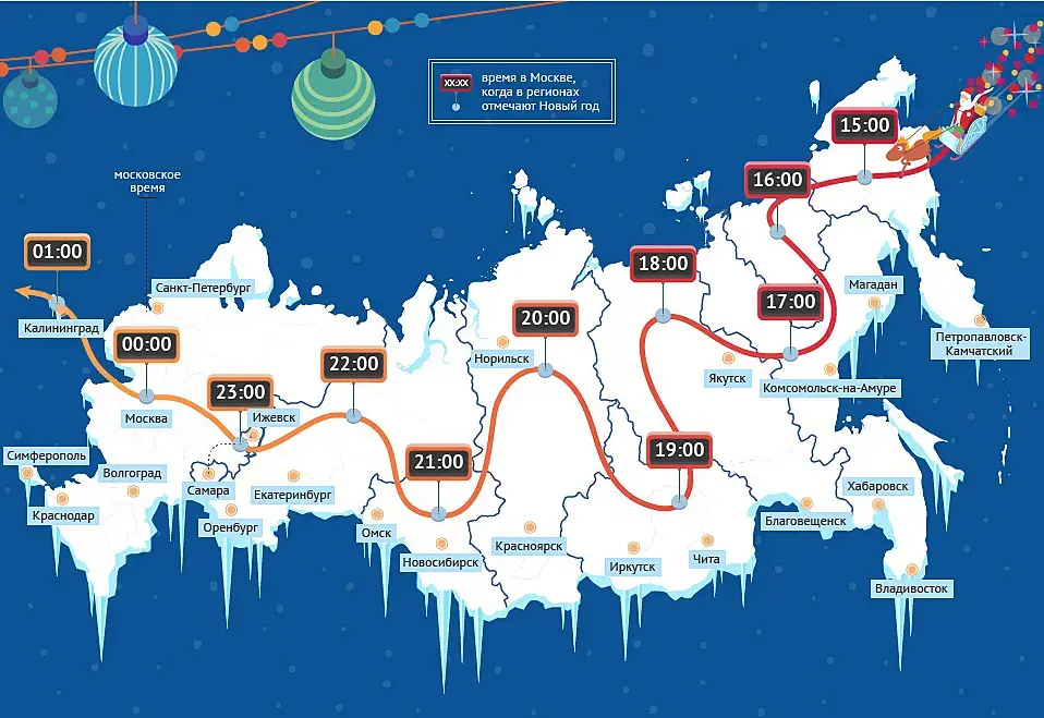 Берешь тазик оливье, раскладываешь по контейнерам, летишь на Чукотку, под куранты начинаешь есть заветный салат, садишься в самолет, летишь на Сахалин, опять ешь, дальше в центральную Якутию или Приморский край, тоже что? - правильно - ешь! И так далее, до Калининграда!