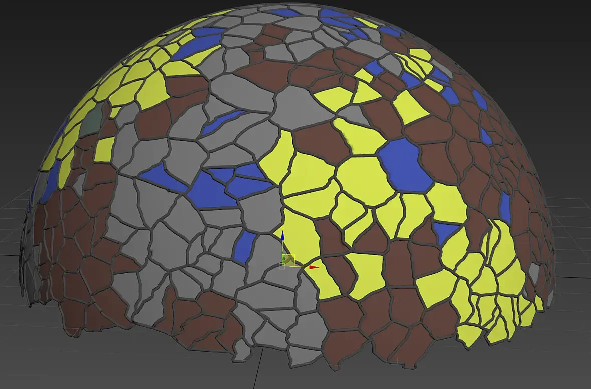 tyflow: Рождение геосферы, разбил вороным, все что ниже 0+-random: delete. Рандомизация материала из ID кластеров. Потом уже с этим мешем работал вручную: Volume select vertex по карте шума, потом twist по Z чтобы сделать неровные края, но не ломать плоскость кусочков. Потом Edit Poly выделение всех контуров элементов >Convert to spline>tySplineMesher, т.к. родной sweep зависает на 2 минуты. Вот тут засада, получается вокруг каждого кусочка замкнутый контур, пересекающийся с соседними.