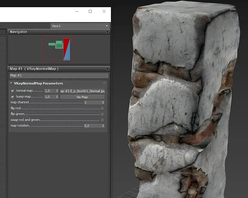 В материале VrayMtl в Bump map добавляю карту VrayNormalMap, далее соответсвенно в раздел Normalmap саму текстуру normal.
