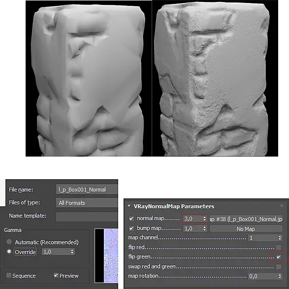 да.вот, один из 3х вариантов даст правильный результат.как правило - 1 вариант даст черные артефакты на шейдер-более, другой даст эффект отсутствия групп сглаживания , а третий - будет работать адекватно.(как убрали настройки битмап инпут гамма в максе я вообще запутался как оно все работает и в вирее именно таким методом делаю)попробуй прорендерить в сермате - чтобы был виден только бамп - можно будет оценить