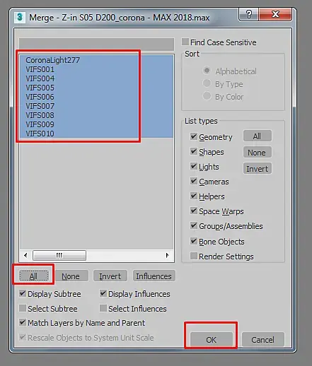 далее в открывшемся окне, выделяем все (или в зависимости от того что именно нужно импортировать из файла выбираем отдельно) и далее нажимаем ОК.