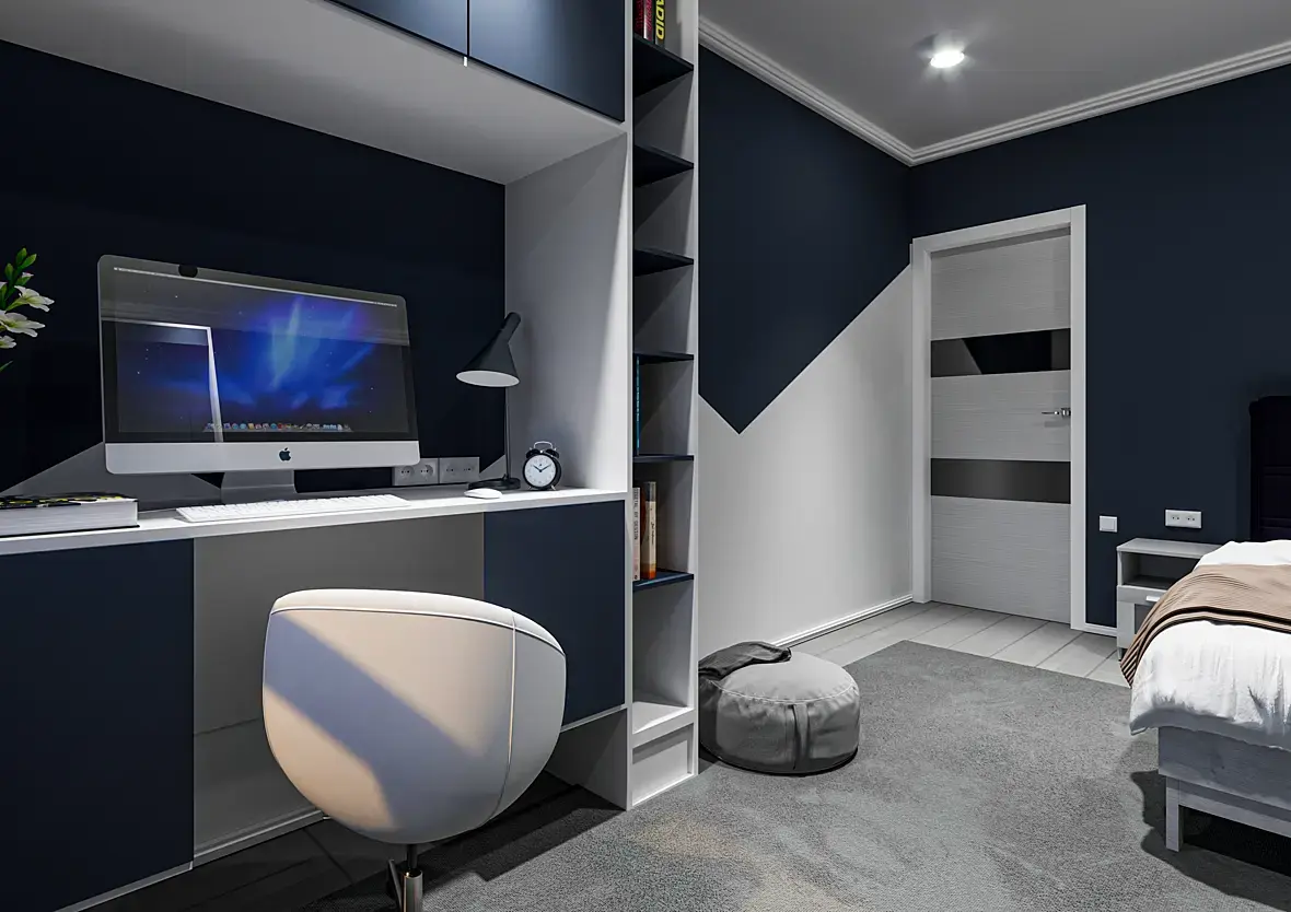 На тумбочку что-то поставить декоративное, можно светильник. Или бра на стену возле изголовья кровати. На консоль возле зеркала декор. На стеллаже каждую полку заполнить книгами или декором детским. На полу игрушки. На стенах можно тоже декорчик или рамки. Ввести другие цвета если заказчик не против. Растения какие то можно немного тоже если зак. не против. Освещение в комнате правда как вечернее. Значит от окна свет убрать. Для дневного наоборот, выключить светильники внутри или убавить очень.