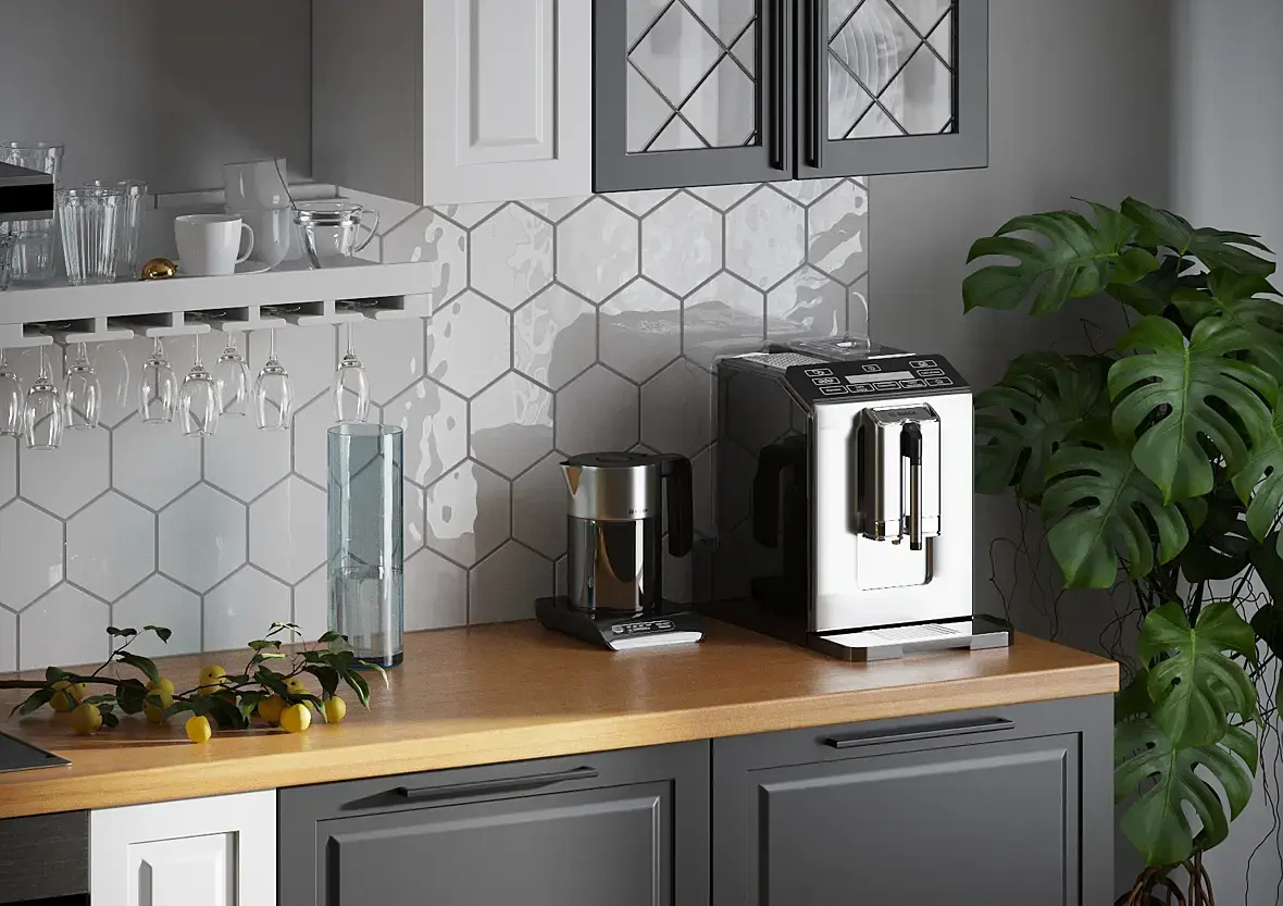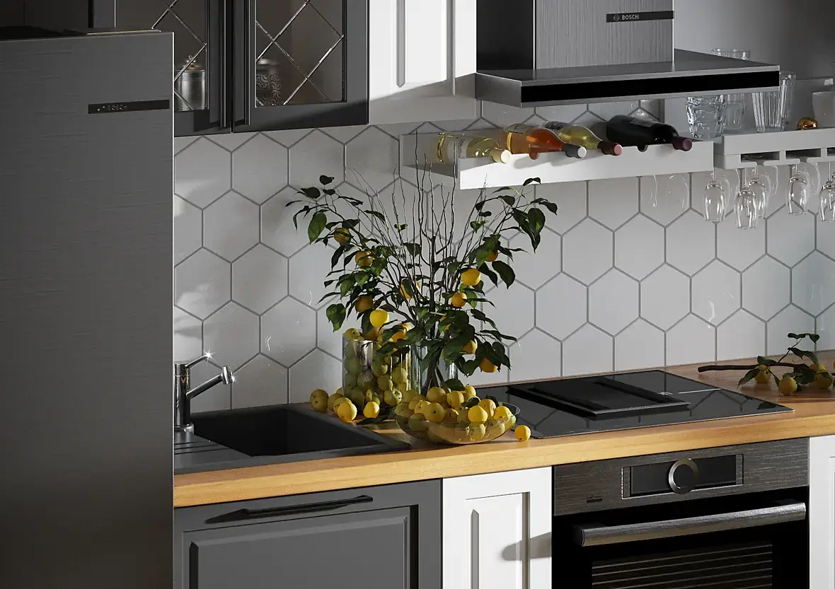Ракурс очень задран, опускайте камеру на человеческий рост. Швы между плиткой на полу и фартуке - 2 мм. максимум, у вас чуть не сантиметр.