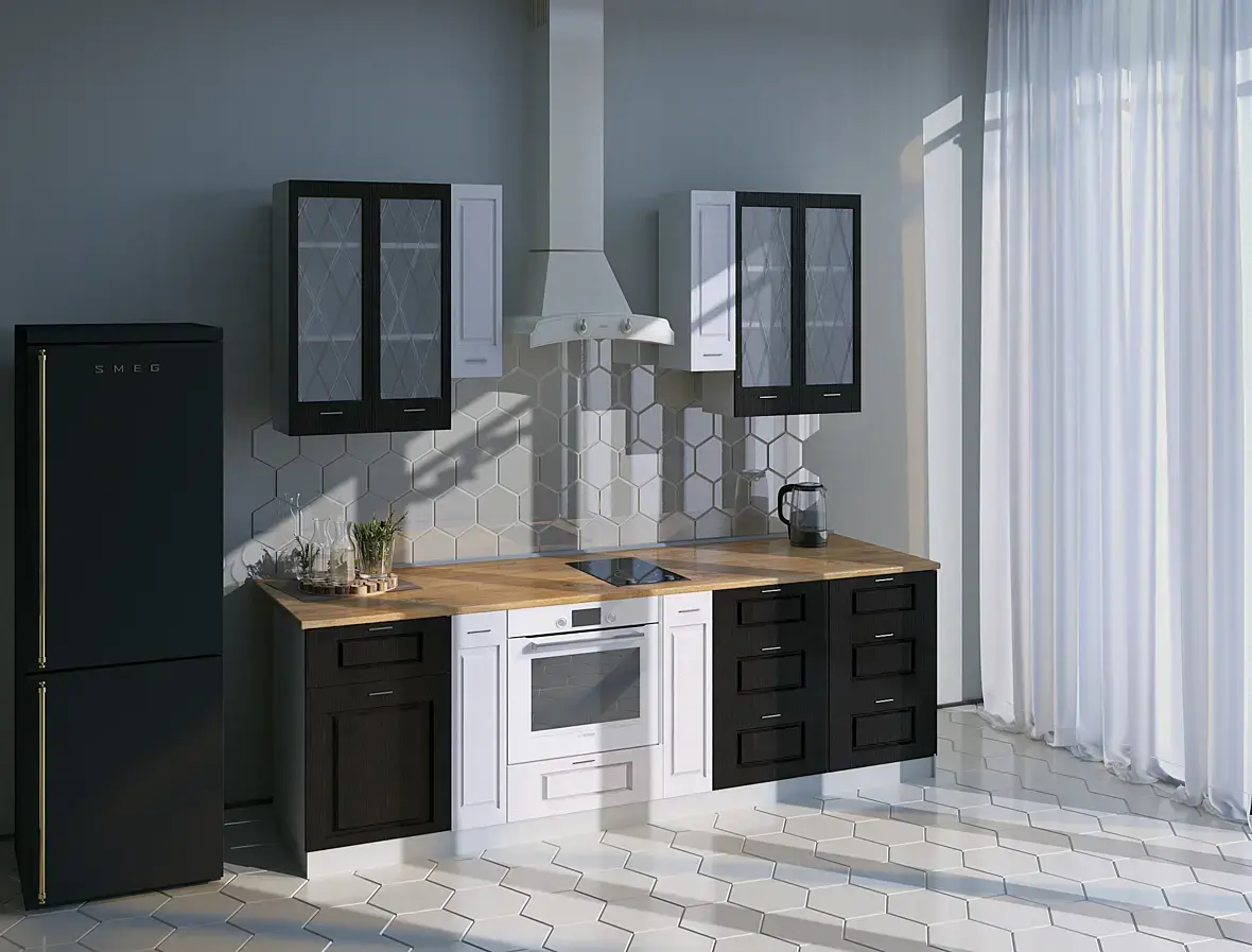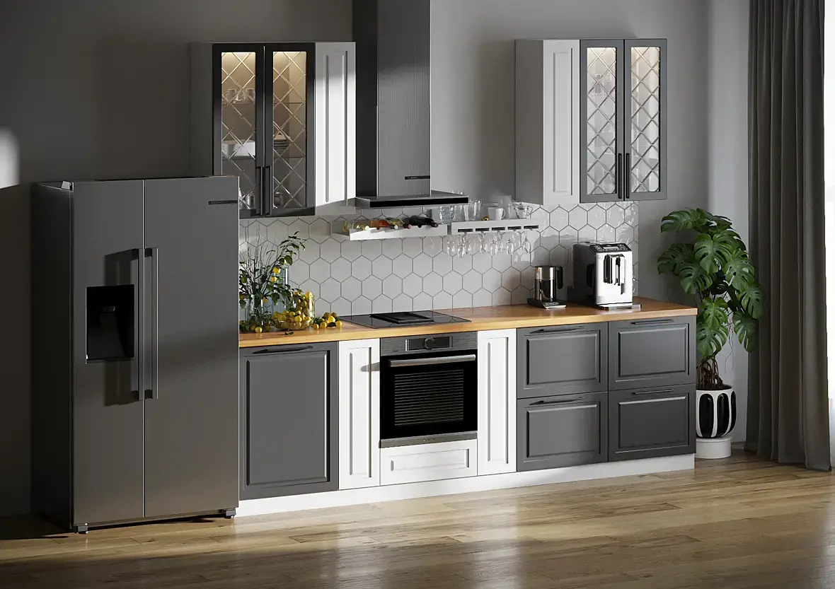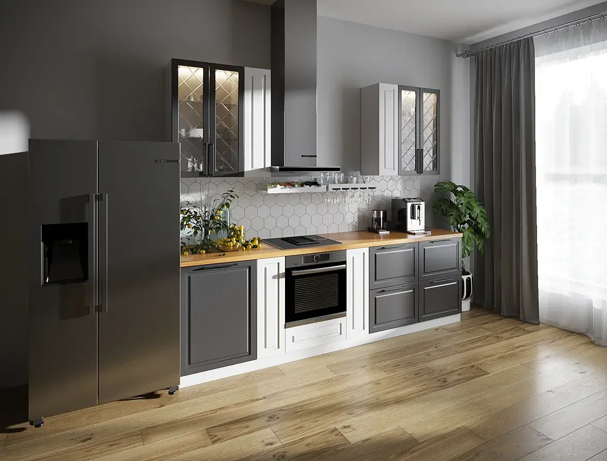 Если у кухни видимые бока, логичнее ставить панель в цвет фасада. И можно перечислять до бесконечности, но суть в том, что если вы визуализатор, то вам заказчик должен дать всю информацию - о филенках, столешницах, ручках, наборе баз, высоте ящиков и т.д. Не вы должны это додумывать, тем более при отсутствии опыта.