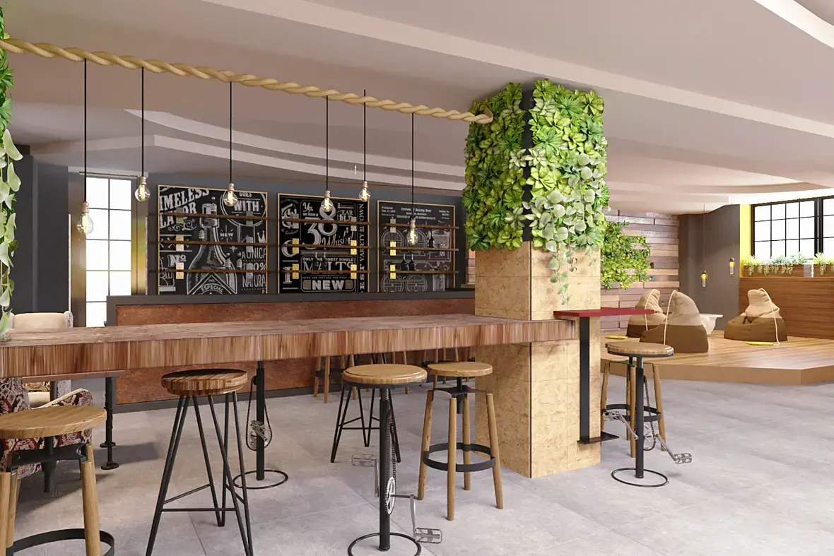 Вам разве не бросается в глаза горшок, который врезался в диван, листья, которые врезались в столешницу, столешница барной стойки вообще без развёртки, шнуры ламп все в канат а одна насквозь, в зоне мешков тоже светильники сделали на разную высоту а колпаки к потолку опустить поленились, если одна текстура для пола, тот же floor generator покрутил бы её в разные стороны и не так бы бросался тайлинг, барная стойка расположена низко(барные стулья по высоте почти как столешница, хотя столики на колоннах выше) как за ней сидеть? .. ну и ещё много чего не касаясь самой визуалки ( свето-тени и бликов).