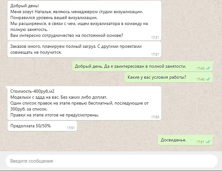 P.S 3D уже очень очень давно является единственным источником дохода. И я его просто ненавижу. И очень сложно соскочить. Потому, что деньги нужны всегда. На работу не устроишься, достойной альтернативы просто нет. 25-35 т.р которые в Нижнем Новгороде предлагают практически в любой сфере не кажутся привлекательными от одной мысли, что надо выходить из дома и вставать по утрам. Банально город огромный и ехать хорошо если меньше часа до работы, а потом обратно часа 2 это же просто самоубийство за такие деньги. Столько можно заработать и дома сделав 1 квартиру в 70 кв метров (беру 500р - 550 за метр). Под клиента вообще никак не прогибаюсь. Даже если предлагают 400р. Борюсь за эту разницу в 3000т.р с квартиры) не иду не на какие уступки. По факту много заказов естественно сливалось. Но я настолько ненавижу 3д, что готов просто из за 3т.р потерять все и сидеть без денег).В общем 3д мне вообще никак не нравиться, и такой думаешь ну еще 1 заказик сделаю за квартиру заплачу и все. Никакого 3д. Но оно так не работает.) Да и работник из меня так себе.