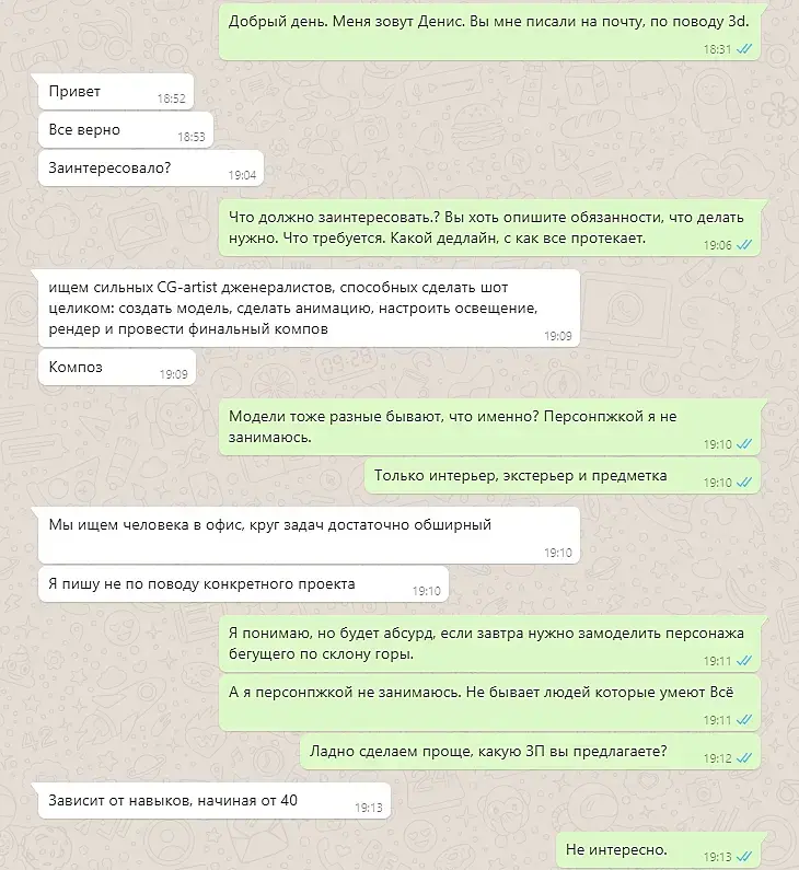 Вот такое еще есть) Человек сам мне на почту написал.Тело письмо было следующее."Денис, привет!Меня зовут Антон. В данный момент мы ищем cg-artist'ов и арт-директоров. Находимся в центре города в офигенном офисе) Нас заинтересовало твоё портфолио, жду ответ! Спасибо."