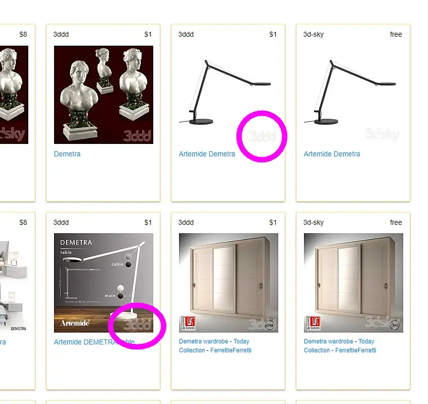 Точно помню, что видел в местной базе модель настольной лампы Artemide Demetra Table. И поисковик 3dmdb.com помнит эти модели. Но сейчас их в базе нет, по крайней мере по логичным хештегам Artemede, Demetra. Это авторы удаляют свои модели или проблема в чем то другом?