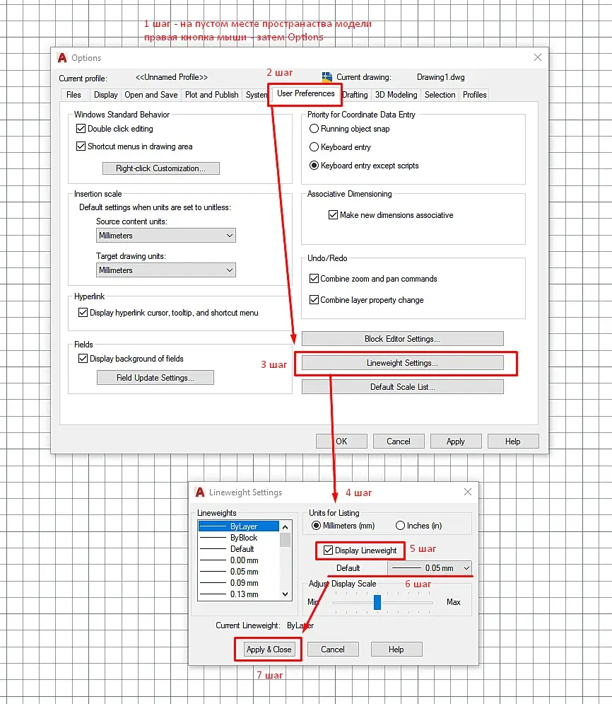 на 5 шаге указываешь, чтобы отображались толщины линий в пространстве модели, на 6 шаге указываешь, чтобы по дефолту линия рисовалась тонкая (потому что по умолчанию толщина линии на слое идет по дефорлу, и автокад ее выставляет 0,25 мм., что жирно), можно поэкспериментировать с визуальным масштабом толщины линии на ползунке ниже.