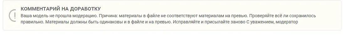 Текстуры в файле PBR и были экспортированы из Substance Painter. Рендер превью производился в Marmoset Toolbag 3 с подгруженными ЭТИМИ текстурными картами. Каким образом они могут не соответствовать тем что находятся в файле? И что вообще можно сделать чтоб модель уже наконец пропустили.