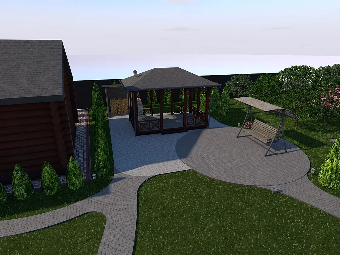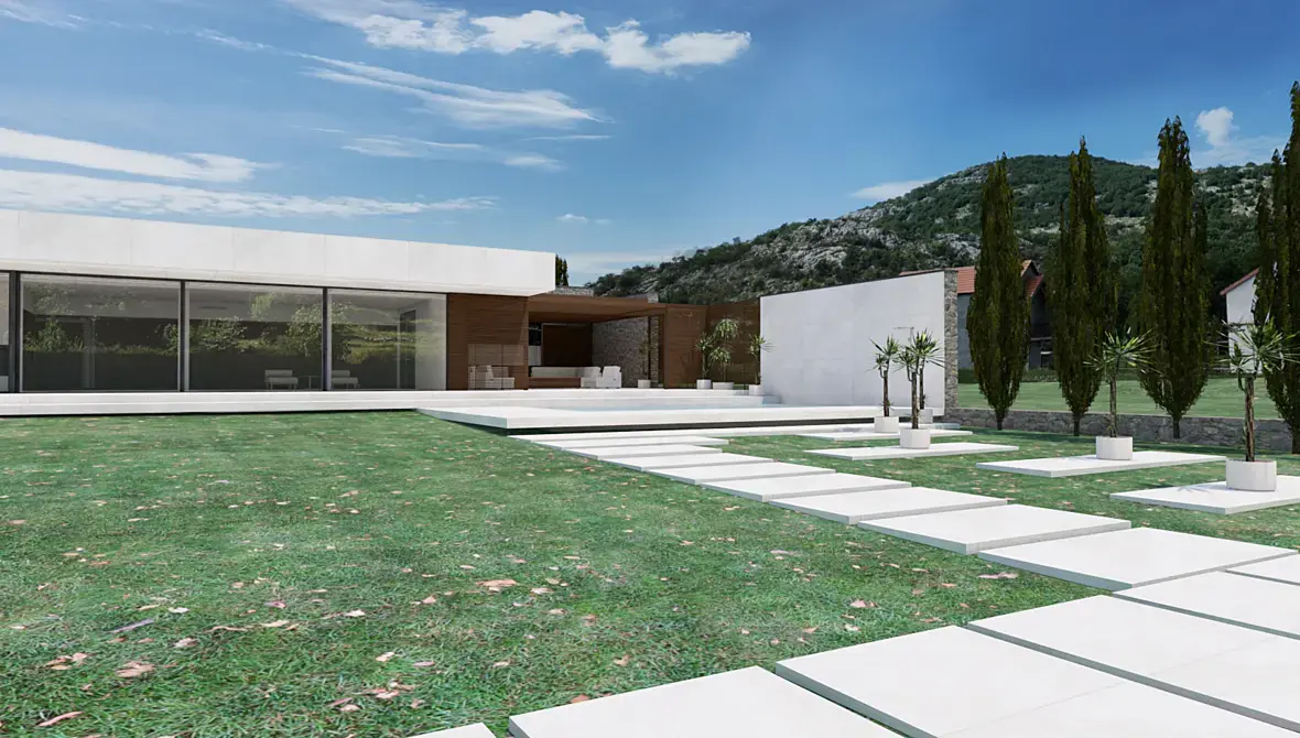 Вот к примеру просто тестовый рендер концепта без детализации и с текстурой вместо травы. Трава кстати отлично получается и занимает мало времени. Конечно с серьезными рендерами это не сравнить, но более чем достаточно для демонстрации архитектурных концептов.