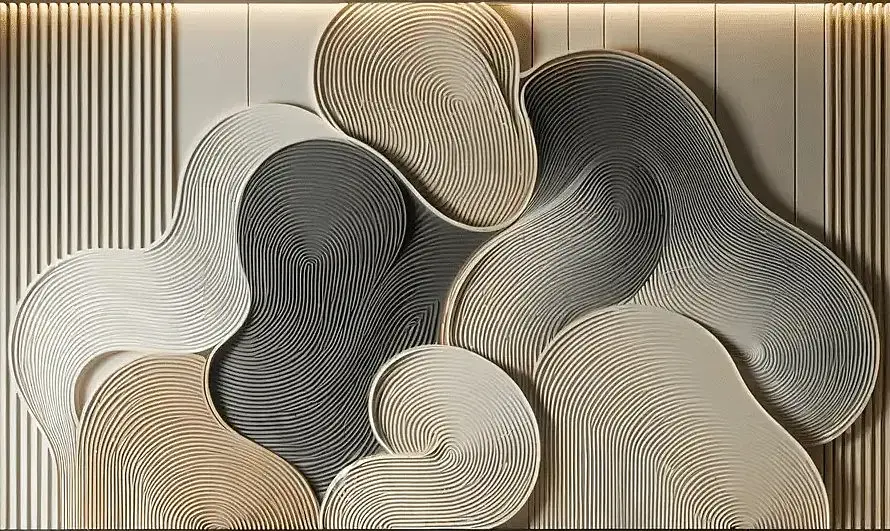 Я бы в фотошопе взял какую-нибудь кисть (типа брызги) и белым по черному нарисовал бы что-то подобное. Потом сделал плоскость по форме панно и бампом или дисплейсом выдавил бы данный рельеф. Для пущей похожести - обвести по периметру сплайном - валиком. Цвет тоже в фотошопе можно сделать...