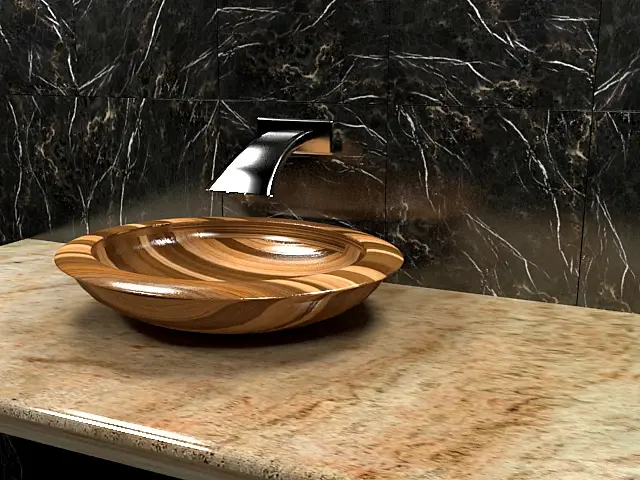 По материалам: поработать над глянцем/матовостью. Пока все какое-то одинаково блестящее - камень, раковина, и не там, где нужно. Мрамор на стене, например, можно сделать более глянцевым, а столешницу - поматовее (и текстуру на ней развернуть или заменить или затайлить получше). Блики прям ядерные, потренируйтесь может быть более рассеянный свет давать и например настройки рендера как-то потыкать