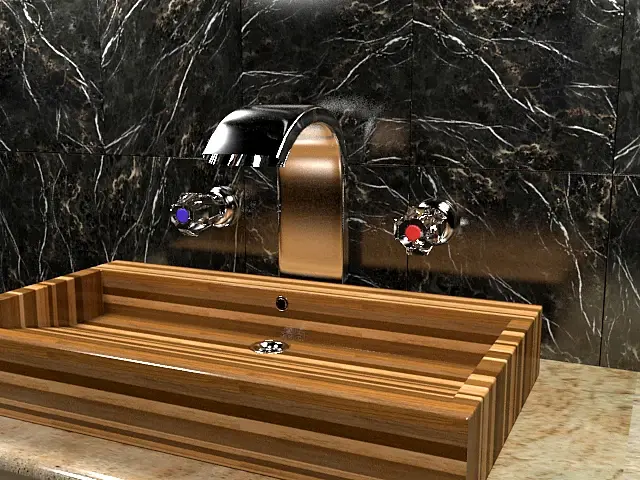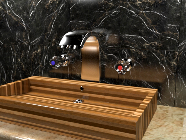 По материалам: поработать над глянцем/матовостью. Пока все какое-то одинаково блестящее - камень, раковина, и не там, где нужно. Мрамор на стене, например, можно сделать более глянцевым, а столешницу - поматовее (и текстуру на ней развернуть или заменить или затайлить получше). Блики прям ядерные, потренируйтесь может быть более рассеянный свет давать и например настройки рендера как-то потыкать