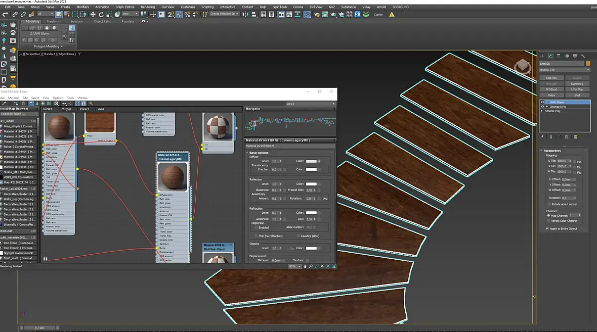 В принципе сработало, прикольно, спасибо за идею! Но правда это костыли какие-то...) Легче было бы копию материала создать без RWS и с ним работать. В описанном вами выше способе всё ок, но надо иметь прямые руки и хорошие навыки работы с развёрткой Unwrap, чтобы что-то красивое сделать. А у меня постоянно работа с анврап - это рандомное тыканье кнопок "авось прокатит", и что самое интересное - оно реально всегда прокатывает и всё получается норм, но очень хаотично я к этому иду)) Ну сейчас вот всё получилось. Я создала новый мат, самый простой, кинула в него какую-то текстуру дерева (рандомную, другую).... а стоп..! стоооп... надо было кинуть в него ту же текстурку)) Тогда бы я волокна дерева на ступенях сразу настроила бы по вкусу как мне хочется и по масштабу... Ыыыы)) Точно...