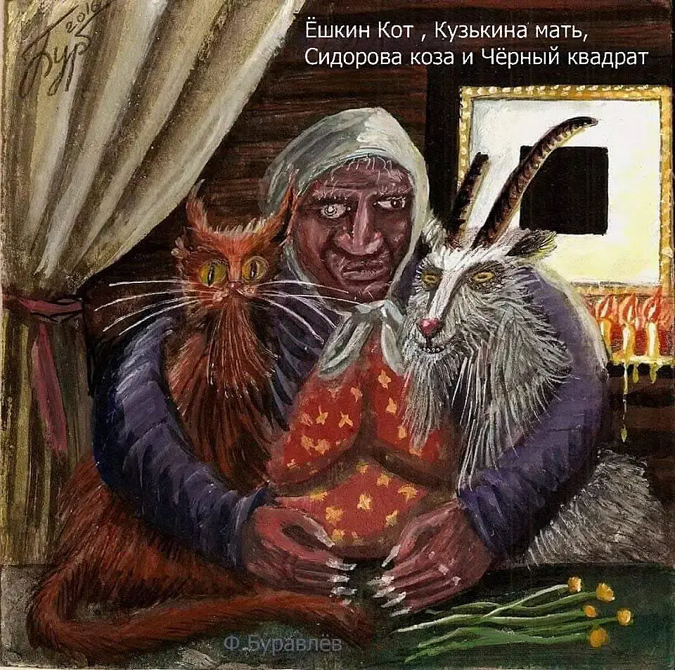 Travinka, какая мамаша у Кузьмы хозяйственная, все в дом - козу у Сидора увела, квадрат у Малевича скопировала, только бабку Ёшку жалко: как она без кота будет на старости лет