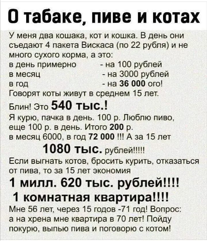 Тоже как-то попыталась "подсчитать" своих котегов, которые мне 100 у.е. в месяц выходят... Старшему сейчас 13 и, судя по нему, помирать в ближайшие лет 5 он точно не собирается