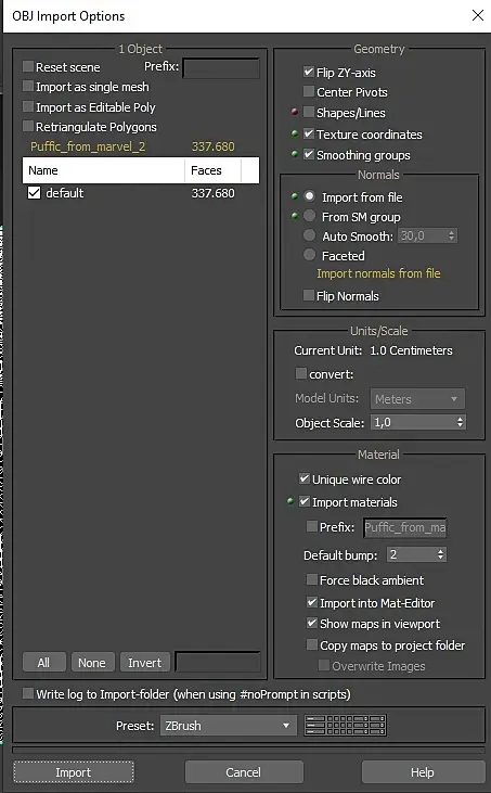 Сделал ткань в MaervelousDesighner, експортнул в Obj, а при импорте в 3D Max объект автоматически упрощается. При этом в других редакторах модель корректно импортится, а 3DMax превращает модель вот в такое простейшее. Может это я простейшее и не могу понять в чем дело?