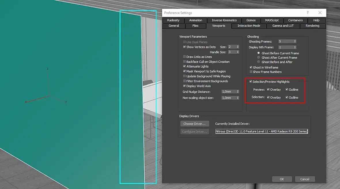 Галочки в Preferences > Viewports > Selection/Preview Highlights изменял, моргает во время применения настроек и снова не работает. 3DS Max перезагружал.