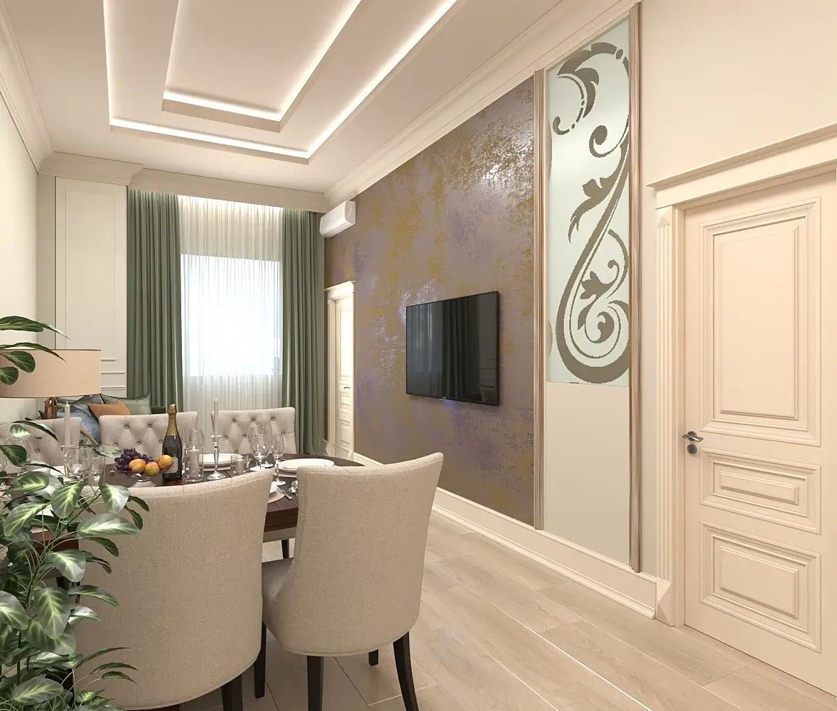 Меня больше смущает трехуровневый потолок. Особенно если рассматривать его как единственный источник освещения зоны в темное время суток... Треш. К тому же трехуровневые потолки устарели лет на 15.