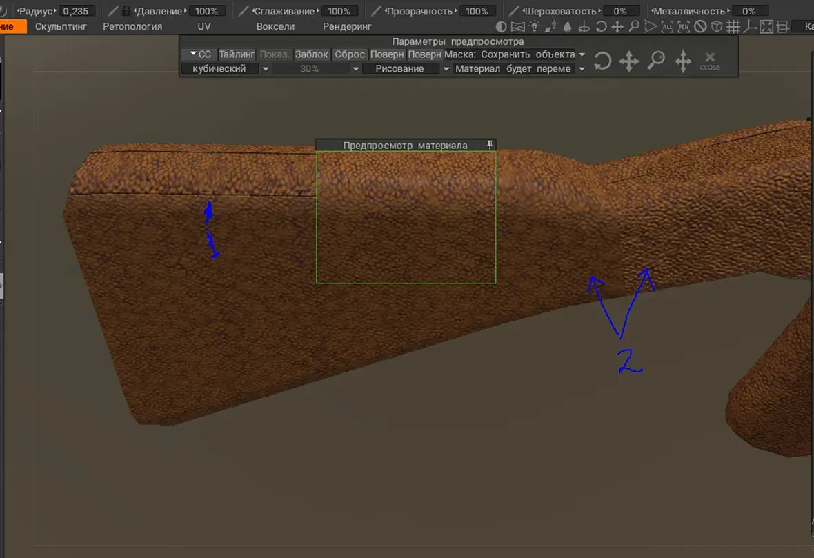 Делаю модель оружия в 3d coat. Для заливки текстур материалами, программа рассчитывает карту курватуры. В последствии заливки, текстура выглядит каряво (одна и та же имеет в разных частях, разные шероховатости), у другой же вообще появляется разделительная полоса выступающая из залитой текстуры. Причем в окне предварительного просмотра заливки - все ок. Как это можно пофиксить ( возможно пересчитать программой эту карту)