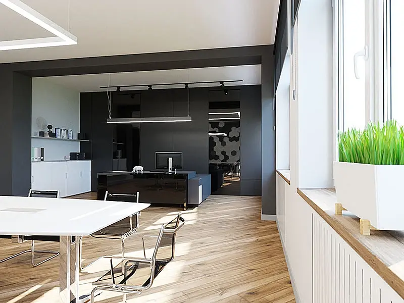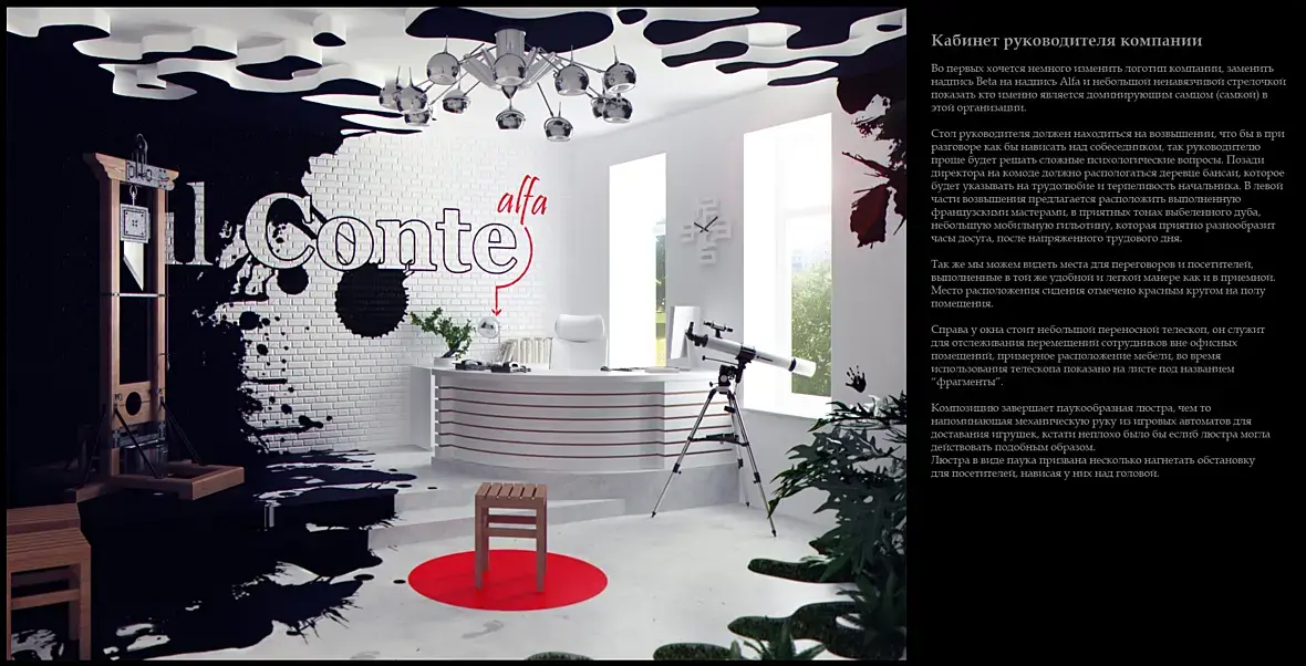 Вот мой пример, я делал дизайн кабинета для двух директоров, всем очень понравилось, может вам поможет. А вообще работу с заказчиком нужно начинать с аналогов, нужно полистать журналы и пусть определится со стилем. иначе это доение козла получается.