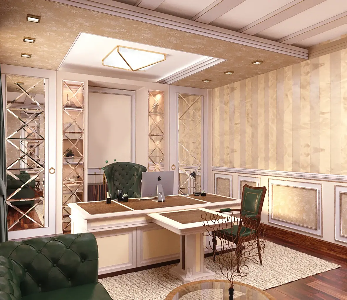 Посмотрел все ваши варианты и знаете что я понял? Помещение для кабинета маленькое и вам надо его визуально увеличивать: "раздвигать" стены с помощью светодиодной скрытой ленты, использование глянцевого МДФ, сделать всё светлым и воздушным пол и стену где герб одним цветом и прочие подобные махинации.