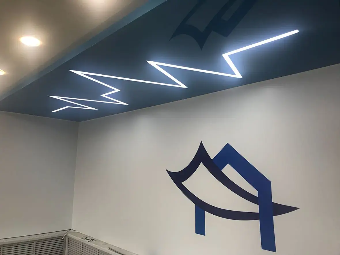 Я бы нарезал на плейне cut-ом нужную фигуру, а потом сделал чамфер. Потом перевёл бы в объём любым удобным способом. За объём спрятал бы прямоугольный источник света.