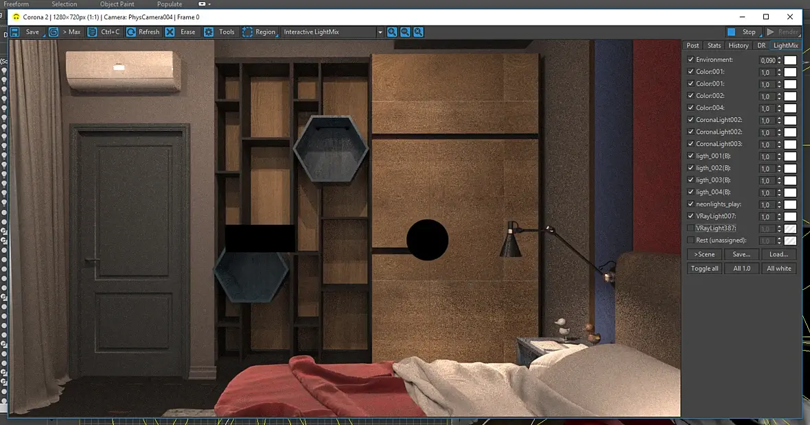 для наглядности по средине сцены созданы CronaLight Sphere, CoronaLight Rectangle (черные квадрат и круг на рендере). что точно ясно: не зависит от ракурса, ибо так на всех видах. если скопировать любой источник света - его(копию) уже не рендерит