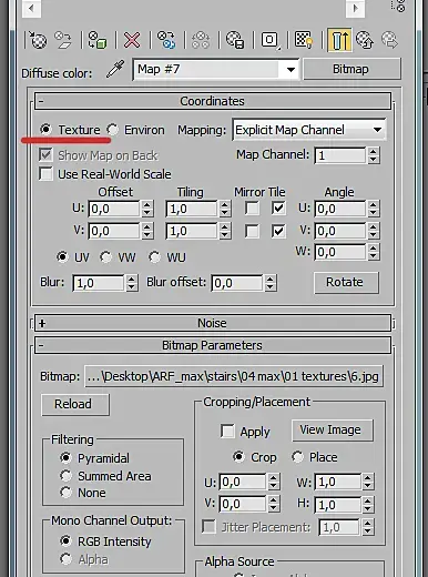 На самом деле, кроме как разбить все ступеньки и на каждую назначить UVW Map (Box) и переключить галку в картах с Environment на Texture - другого решения я не нашла.
