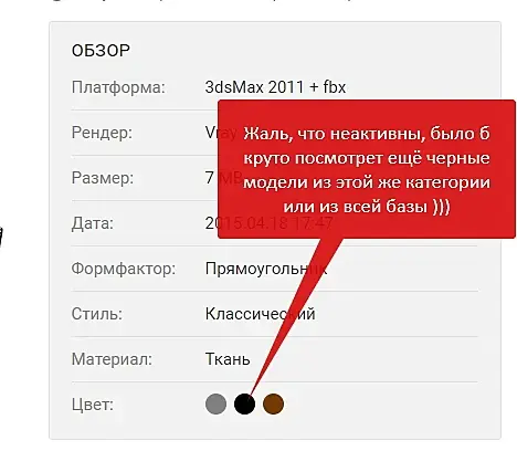 Насчет активности цвета тоже полностью поддерживаю - если он неактивный на странице, то непонятно зачем он там отображается: человек открыв модель уже увидел цвета модели. Было бы удобно если бы они стали активными - для поиска аналогичных моделей по цвету.