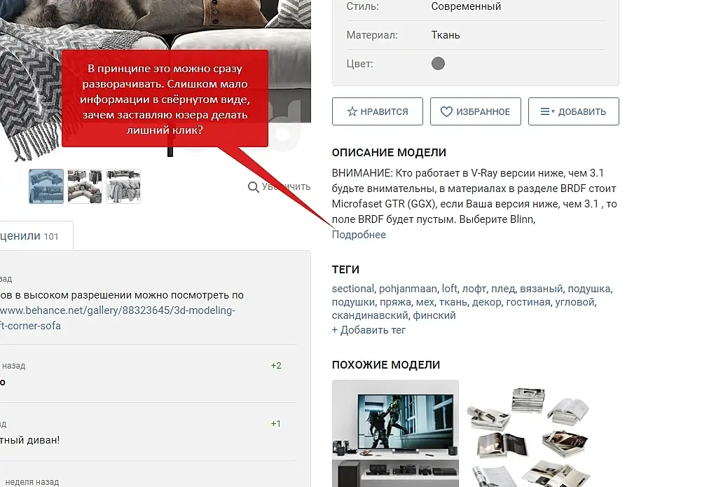 Так же предложение "для поиска аналогичных моделей". Раньше было удобно искать по тегам: по производителю и т.п. А теперь теги убрали вниз под Описание и они не на виду. Предложение Тэги вернуть вверх, чтобы удобнее было искать дополнительные модели. А то получается - тэги есть, но чтобы ими воспользоваться нужно проматать вниз страницы