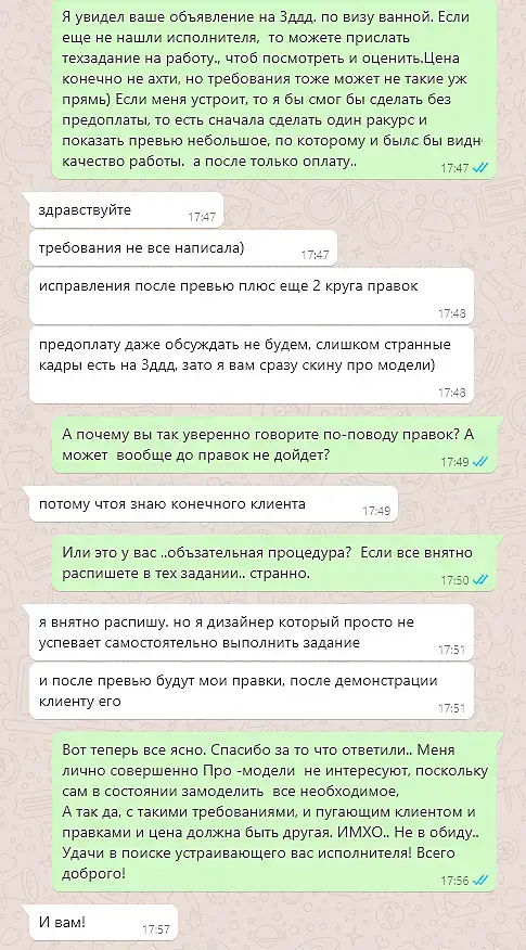 Дело не в принципах, и не в том, кто сколько зарабатывает в месяц.. Просто если коммерчески подойти делать маленький объем, за стандартные расценки.. за кв метры, ясный перец не выгодно, при том что, требования по ТЗ, далеко не стандартные, и когда даже близко не рассчитаешь на сколько все это затянется.Делать 8 м2, больше недели, капец как обидно)))А когда твой объем, целый дом, никто и не станет наверное повышать цены за санузлы отдельно,. это все скомпенсируется большим объемом, не так ли?Меня тоже терзал вопрос, увидев объявление, что же за ванная такая, которую никак не могут закончить, вроде по рефам, для ориентира представленным, ничего там "сверхзапредельного "не увидел.Ну и как наверное некоторые отсюда , не удержался, поинтересовался.)Думал, выкладывать нет, с точки зрения "этикетки" потом ..думаю, в принципе она сама же должна была сразу озвучить свои требования для всех, здесь на доске, и не было бы такого бурного обсуждения, не зная самой сути. Думаю тут ничего криминального нету.. Спросил и мне ответили.