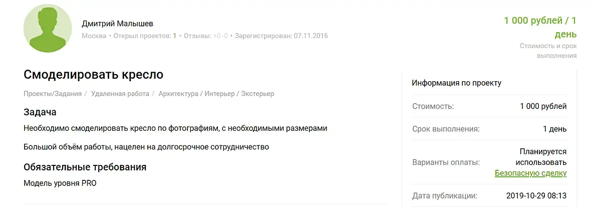 Ну если брать Артема, можно скачать его видео, как он моделит, из тех что я видел могу предположить что на такое кресло у него уйдет часов 6-7, не знаю сколько берет Артем за час своей работы, но думаю, не меньше 20$