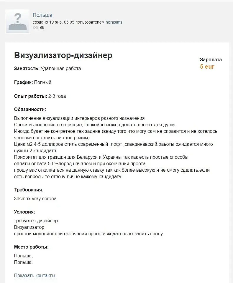 Здесь висела вакансия для украинцев с переездом в Польшу, ЗП 1100$ + бонусы. Не знаю кто туда едет. Понимаю ехать заграницу, когда заработок в разы больше, а тут плюс-минус те же яйца, хоть и незначительно больше ставка. Следовательно делаю вывод, что по цене в Польше за дизайн интерьера должно быть подороже. Тогда как предложение, еще более унизительное, чем ищут соотечественники.