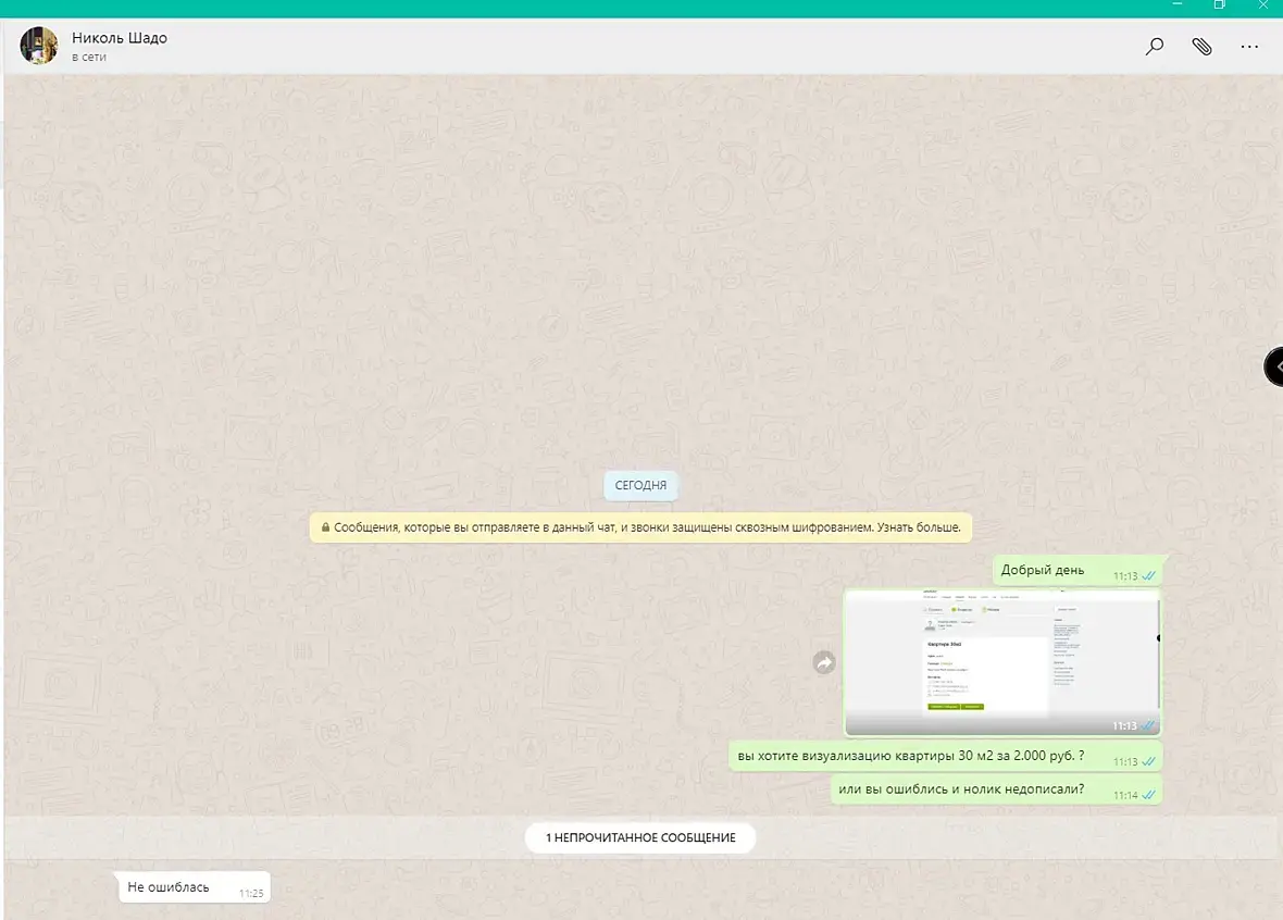 Итого: 2000 руб. визуализиция квартиры 30 кв.м. + 1500 руб. комплект рабочки = 3500 руб.