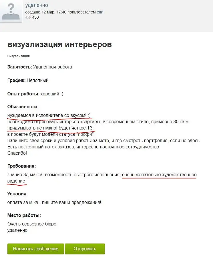 Чего ж тогда 1 человек не собирает полностью машины на заводе? Одна же область. Даже в офисе сидят чертежники и дизайнеры и визеры, а оказывается все это должен делать директор сам, а не нанимать штат. Логика железная у вас. Ну и конечно же вы наверняка сделаете те самые 600 метров за пару вечеров, когда у визеров просто чтобы получить нормальную картинку уходит месяц работы на метраж порядка 200-300 квадратов.
