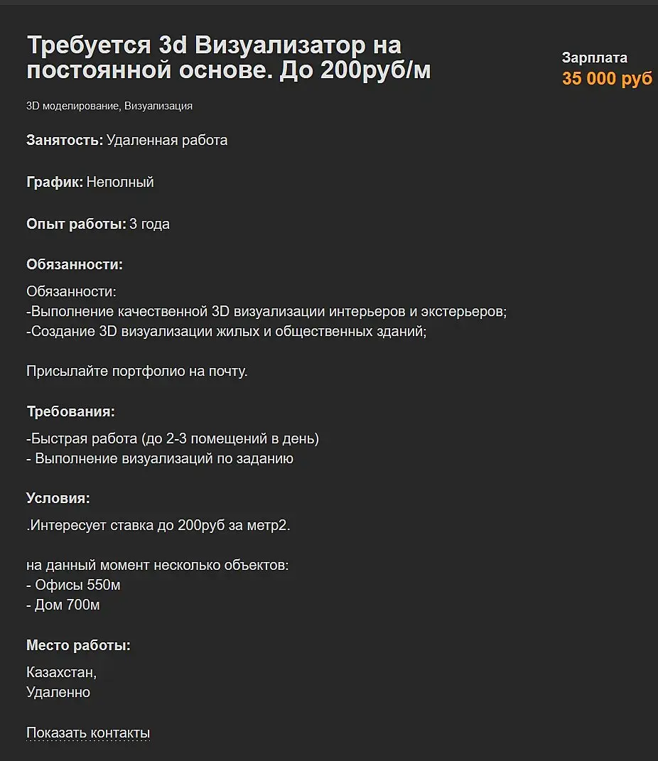 Если считать 5 помещений по 4 ракурса (без клоузапов), то это выходит 1000р за один ракурс ))) Моделить табуретки и картины в рамках для 3дд это золотая жила по сравнению с такими "вакансиями"