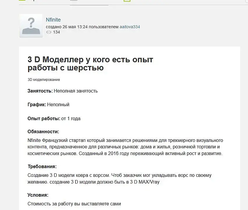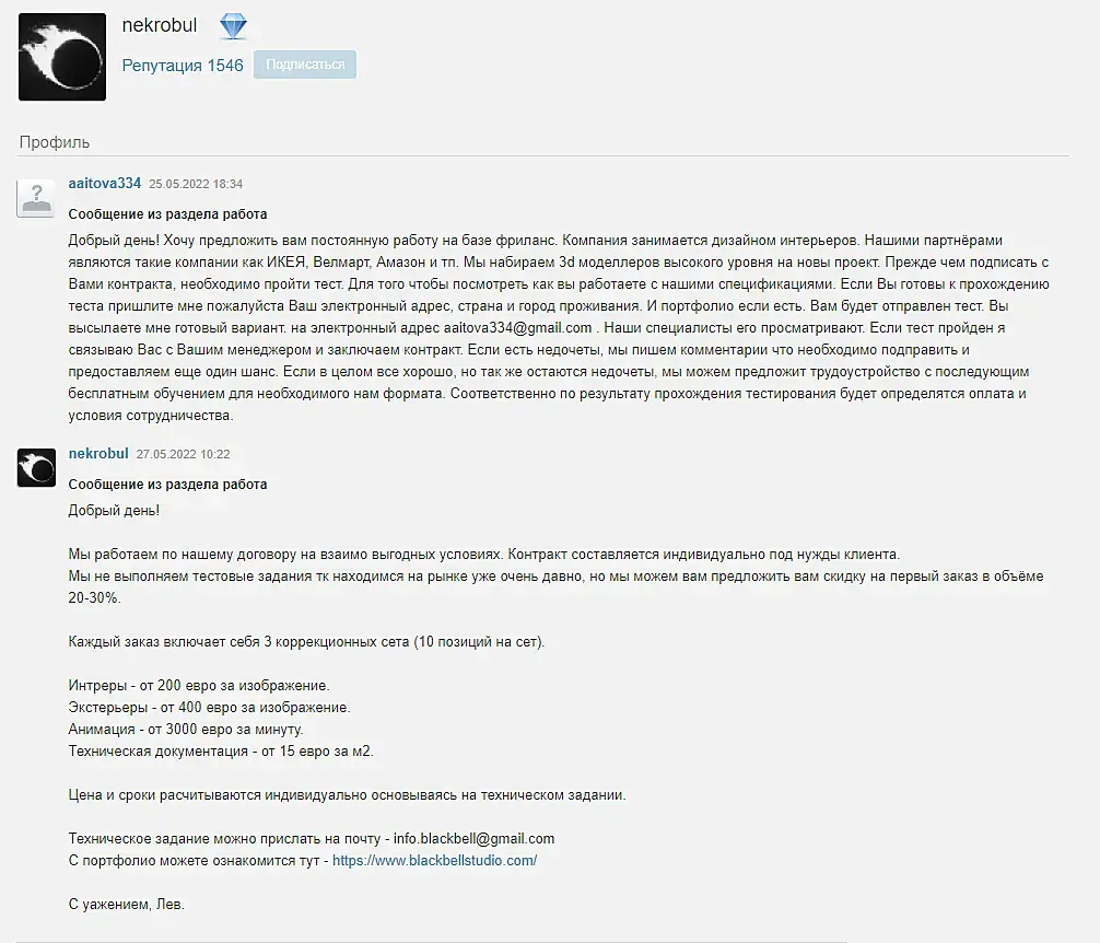 Текст: Добрый день! Хочу предложить вам постоянную работу на базе фриланс. Компания занимается дизайном интерьеров. Нашими партнёрами являются такие компании как ИКЕЯ, Велмарт, Амазон и тп. Мы набираем 3d моделлеров высокого уровня на новы проект. Прежде чем подписать с Вами контракта, необходимо пройти тест. Для того чтобы посмотреть как вы работаете с нашими спецификациями. Если Вы готовы к прохождению теста пришлите мне пожалуйста Ваш электронный адрес, страна и город проживания. И портфолио если есть. Вам будет отправлен тест. Вы высылаете мне готовый вариант. на электронный адрес aaitova334@gmail.com . Наши специалисты его просматривают. Если тест пройден я связываю Вас с Вашим менеджером и заключаем контракт. Если есть недочеты, мы пишем комментарии что необходимо подправить и предоставляем еще один шанс. Если в целом все хорошо, но так же остаются недочеты, мы можем предложит трудоустройство с последующим бесплатным обучением для необходимого нам формата. Соответственно по результату прохождения тестирования будет определятся оплата и условия сотрудничества.