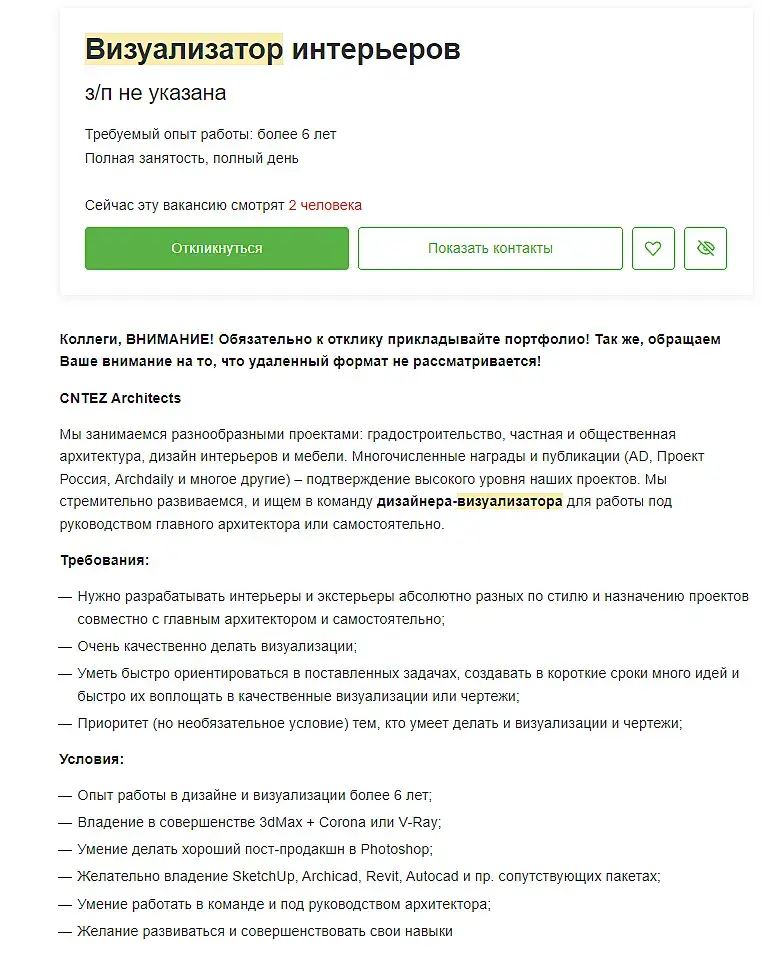 Да полно таких. Привел примеры, как визер из заголовка в тексте превращается в диз-виза, а в требованиях уже ведущий архитектор-дизайнер-визуализатор нужен. Приоритет тем, кто на полшишечки еще и чертит. Во втором визер внезапно рабочку чертит начинает и считает ведомости+спецификации, и все это за зарплату курьера, а в первом случае еще и вчерную =)