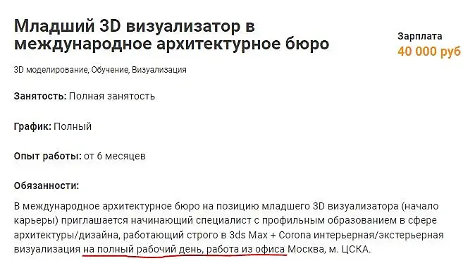 Меня на днях пригласили на должность визуализатор с окладом 160тыс рублей. Сказали, есть одно условие, вы должны выполнить тестовое задание. Оно не оплачивается. Надо собрать сцену коттеджа 280 квадратов, разместить в ней всю мебель, декор и отрендерить. Если нам понравится, ты мы будем с вами работать на постоянной основе. Я отказался. Это была нее на этом сайте конечно. Так для размышлений.