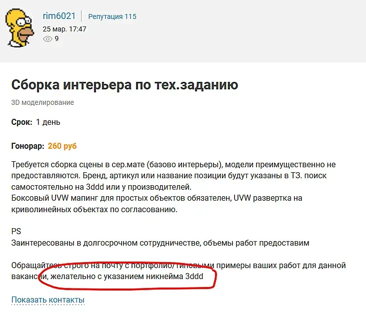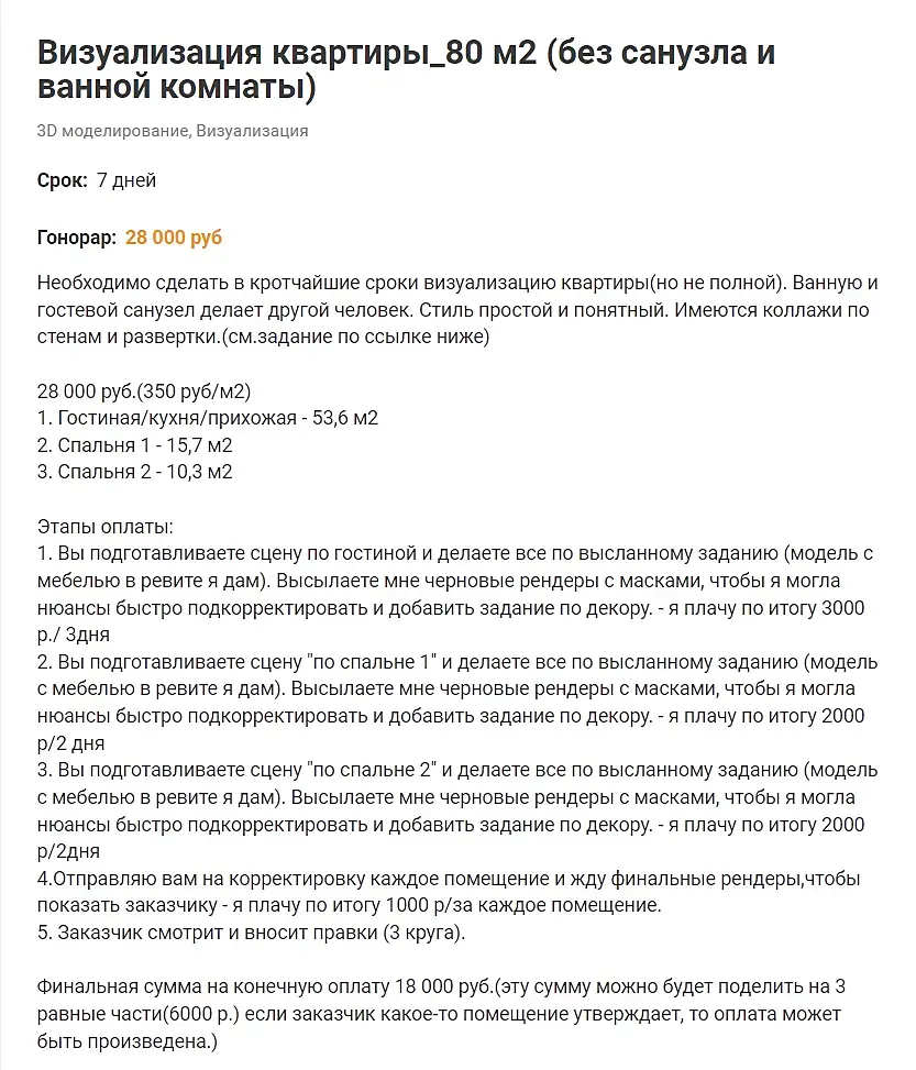 Меня на днях пригласили на должность визуализатор с окладом 160тыс рублей. Сказали, есть одно условие, вы должны выполнить тестовое задание. Оно не оплачивается. Надо собрать сцену коттеджа 280 квадратов, разместить в ней всю мебель, декор и отрендерить. Если нам понравится, ты мы будем с вами работать на постоянной основе. Я отказался. Это была нее на этом сайте конечно. Так для размышлений.