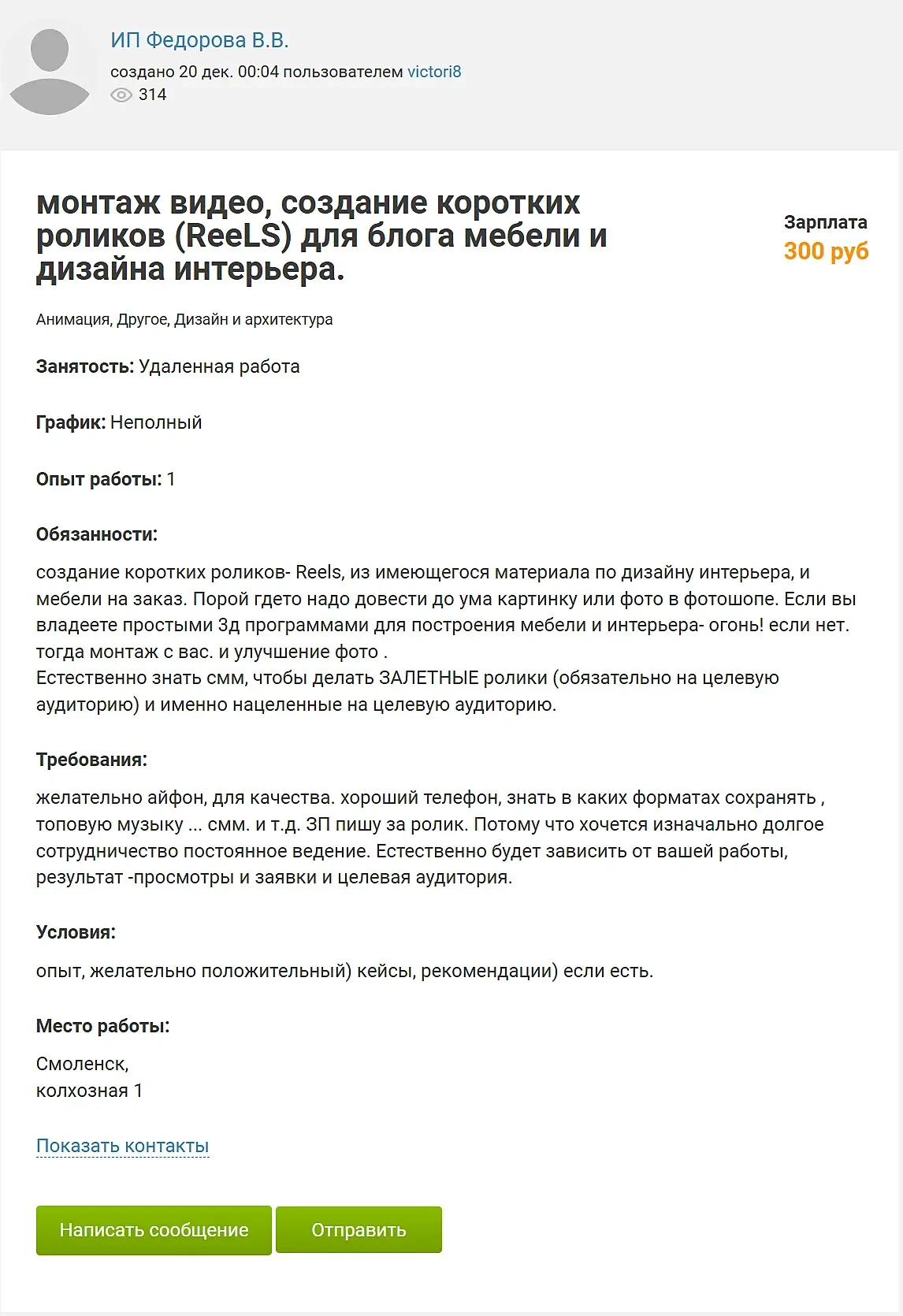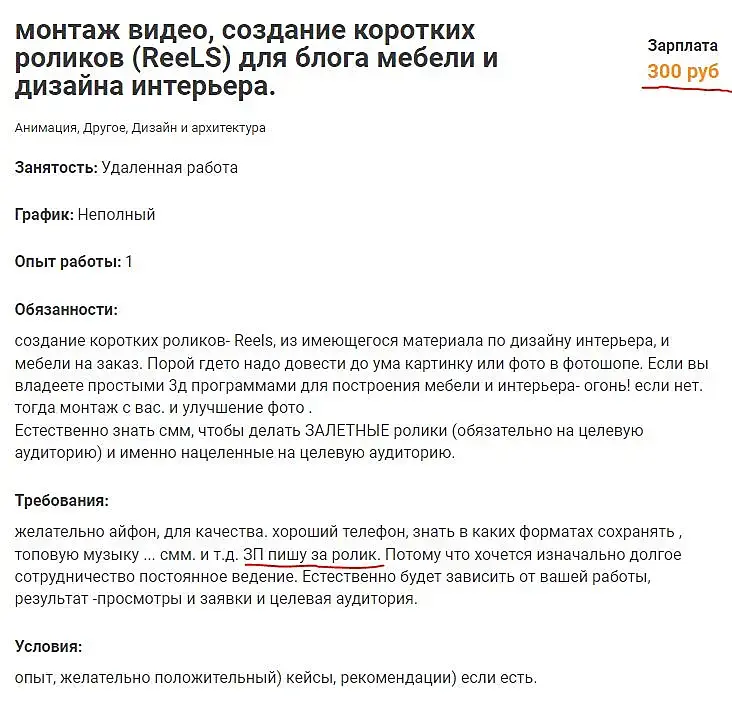 На авито и у маленьких, хоть и региональных, но очень понтовых "диджитал-агенств", склеить рилс стоит от 1000 р./шт. И естественно, как и в крупных проектах по продвижению, на вопрос про гарантии, про то, что залетит в топ или нет, заку вежливо покрутят пальцем у виска. А за 300 рэ, мой практически полностью порабощённый зелёным змием, а ныне безработный 2д-дизайнер, в примере с визитками, сказал что он даже комп не пойдёт включать.