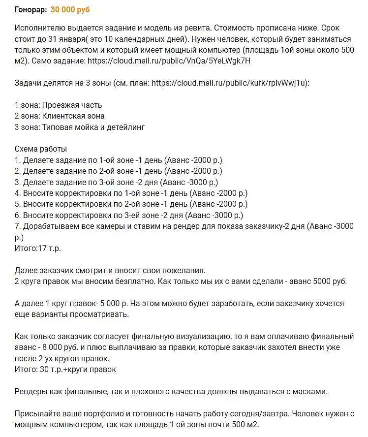 Я писал про биржи и про крупный проект. Хотя понятие крупного весьма субъективно. Новичку делающего однушки, получить на бирже заказ на дом это безусловно успех. Однако мы ведь говорим за крупных заказчиков, опытных исполнителей и материально ответственных задачах. По моему, в последнее время, профилю это рестораны и общепиты. Когда у клиента есть дата открытия, когда день простоя ресторана обходится в сотни тысяч рублей и невыполнение проекта в срок может повлечь за собой такие материальные издержки, которые в разы больше твоего гонорара за проект. Я говорю за такие проекты, а не за виз. квартиры, где ты можешь просто телефонным разговором с клиентом уладить вопрос и попросить несколько дней подождать. Либо если дизайнера кидает визуализатор, объяснить клиенту ситуацию и просто найти другого исполнителя имея средства даже со своего личного гонорара.