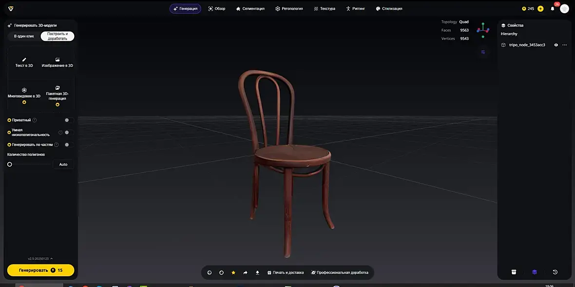 Трипо. На этот стул примерно 10 минут времени на все правсё ушло. Когда аи научится распознавать гладкие прямые детали , цилиндрической формы.и.т.д , и делать их соответствующе форме , многие моделеры всплакнут , кто только на этом сидит и зарабатывает . Я конечно вижу недоработки , но это 10 минут, и проект сдан . Всех все устроило