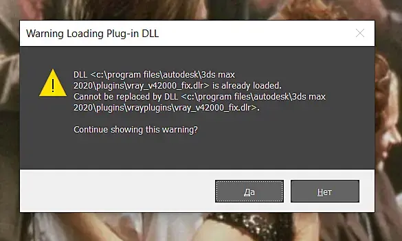 maryshtolc, у вас 2 раза скопирован файл vray_v42000_fix.dlr В папку Plugins и Vrayplugins. Удалите один из них и сообщение пропадет.