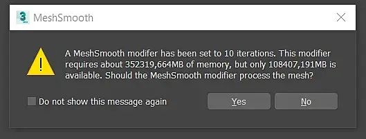 Я так понимаю, что связана она с какой-то моделью, которую я вчера при работе добавила, и у модели дофига полигонов. Нажимаю "нет", но сцена все равно не грузится. А без этого я, соответственно, не могу найти эту косячную модель, чтобы удалить ее или почистить полигоны.